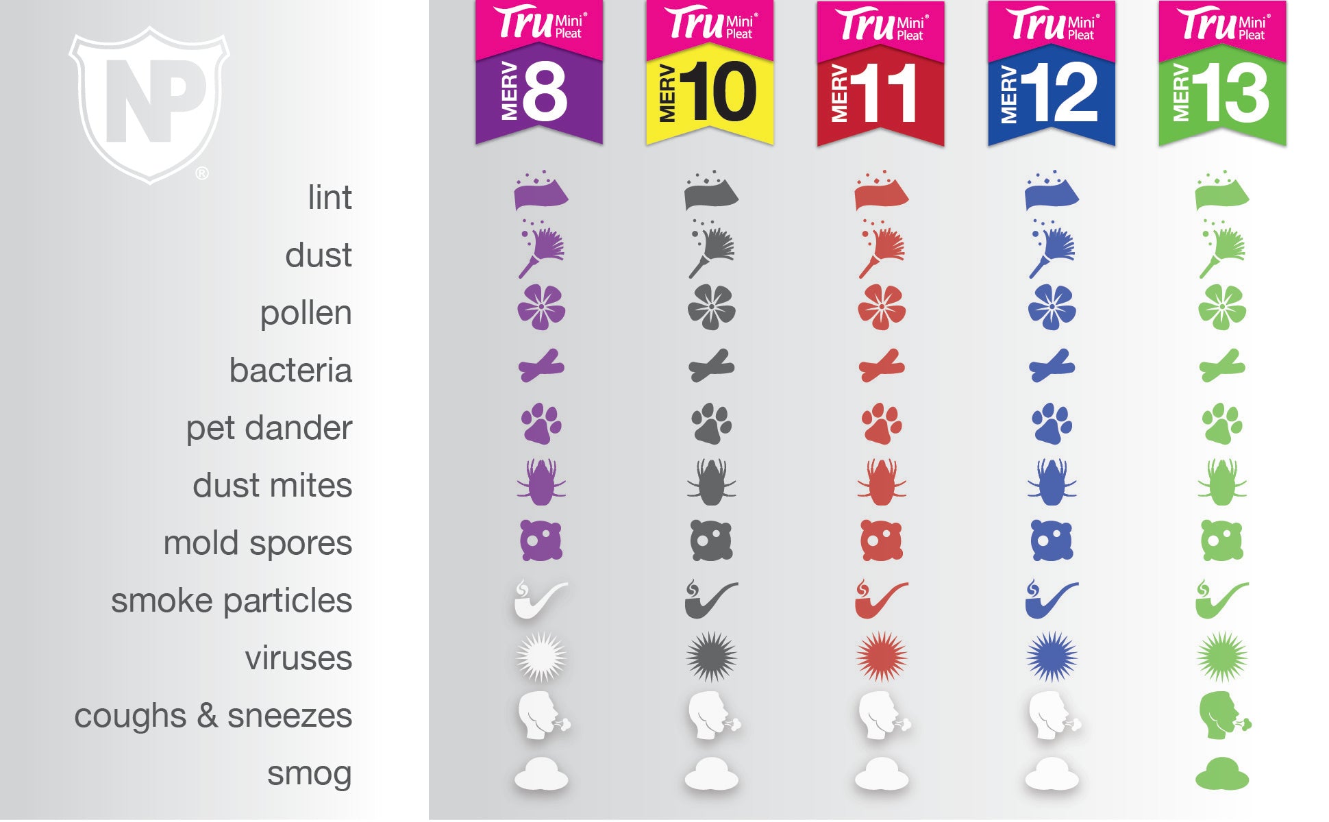 The Tru Mini Pleat filter effectively removes lint, household dust, pollen, pet dander, dust mites, mold spores, smoke particles, virus carriers, and allergens. For consistently fresh and clean air, especially during renovations or home improvements, we recommend replacing your HVAC filter every 2-3 months, depending on your environment.